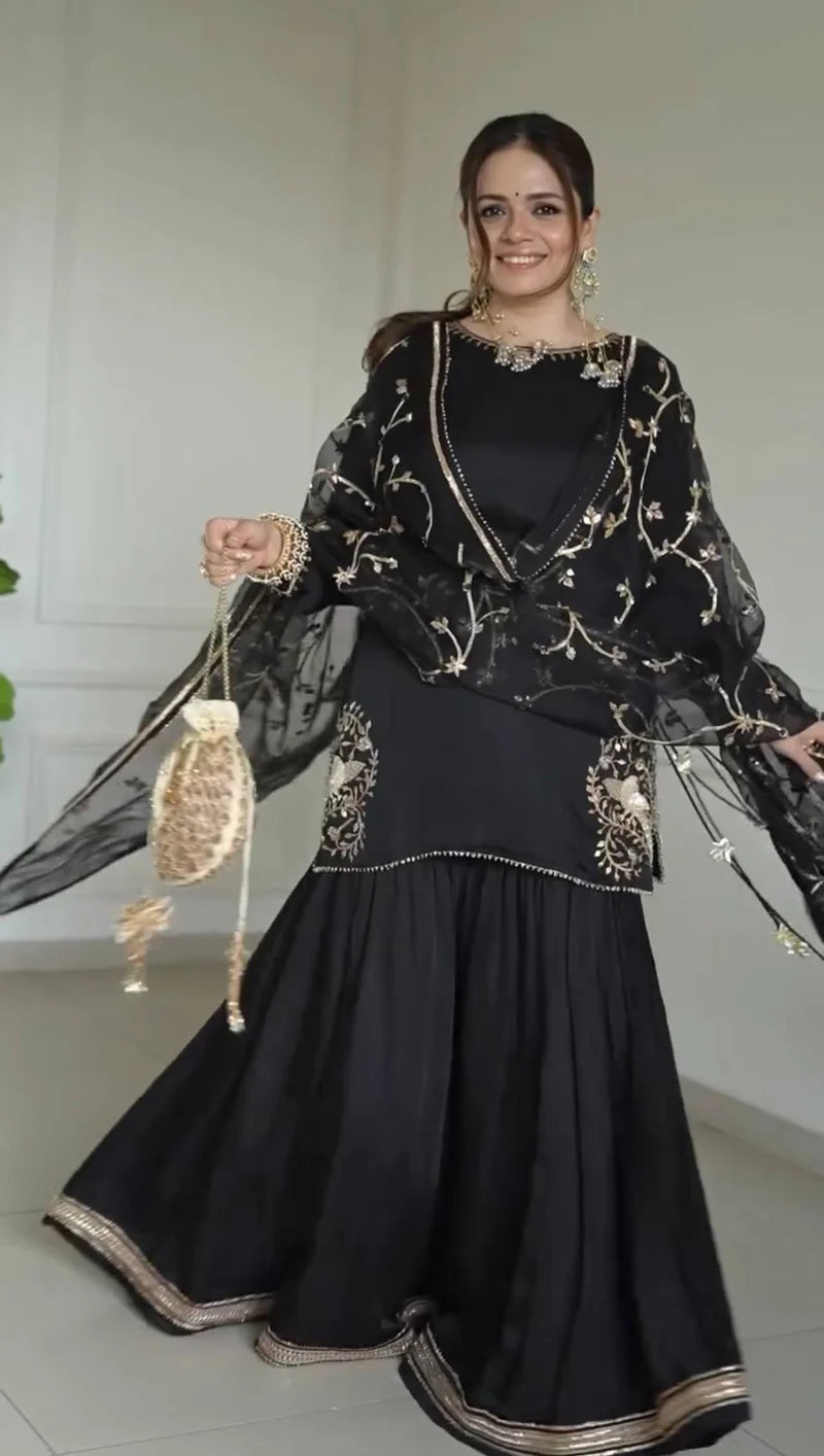 Pure Natural Crep With Embroidery Sequence Work Kurta Set